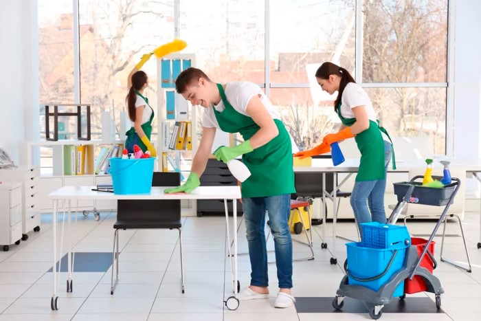 Таким чином, прибирання офісних приміщень включає такі процедури, як вологе та сухе прибирання підлог, прибирання меблів та обладнання, миття вікон, збір сміття, санітарне прибирання ванних кімнат та інших санвузлів. Крім того, можуть надаватися додаткові послуги, такі як миття килимів та великих килимів або прибирання після ремонту.