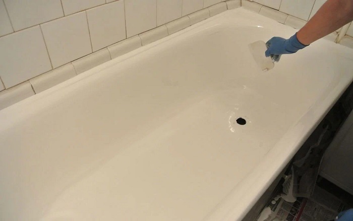 Затем поверхность обезжиривают, чтобы обеспечить хорошую адгезию акрила. После этого материал выливают на дно ванны, давая ему равномерно растечься по стенкам и дну. Специалисты иногда корректируют распределение акрила с помощью шпателя, чтобы достичь идеального результата.